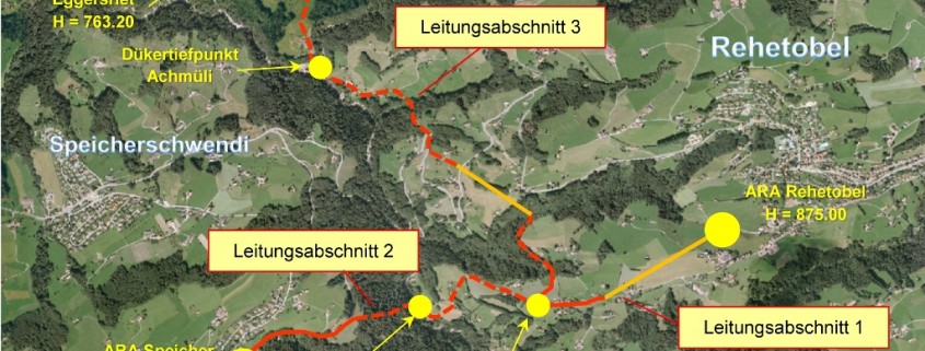 Die Beschreibung speziell passt zum gesamten Projekt, das für budgetierte 6,9 Millionen Franken exklusive Subventionen den Anschluss der Gemeinden Rehetobel und Speicher ans AVA-Netz vorsieht. «Auslöser waren die sanierungsbedürftigen Kläranlagen dieser Gemeinden. Man kam zum Schluss, dass ein Anschluss an den AVA Sinn macht – finanziell wie auch betrieblich und ökologisch gesehen», sagt Christoph Egli. Nach einer komplexen Planungsphase starteten im März die Bauarbeiten. Zunächst werden die Leitungen für den Anschluss von Rehetobel verlegt. Diese verlaufen ab der Kläranlage zur Lobenschwendi. Dort vereinigen sie sich mit den Leitungen ab Speicher und werden doppelt geführt über Habset und Herdli zur Aachmühle verlegt. Via Risel erfolgt dann bei der Oberebni der Anschluss ans bestehende Netz. Neben Tiefbauarbeiten und Rohrlegungen sind zwei Bohrungen nötig, eine von der Kläranlage Rehetobel aus, eine zweite ab der Lobenschwendi.